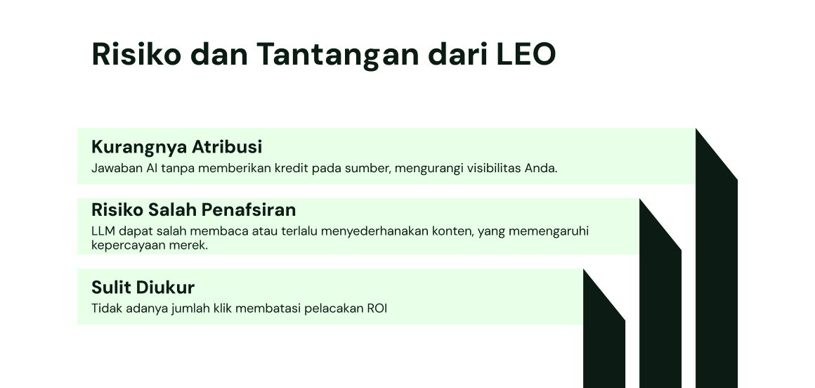LEO bukan hanya tentang visibilitas. Ini tentang menjadi sumber kebenaran yang tepercaya di industri Anda. LEO menghargai konten yang kredibel, membantu, dan ditulis dengan jelas, bukan hanya yang bisa diklik.